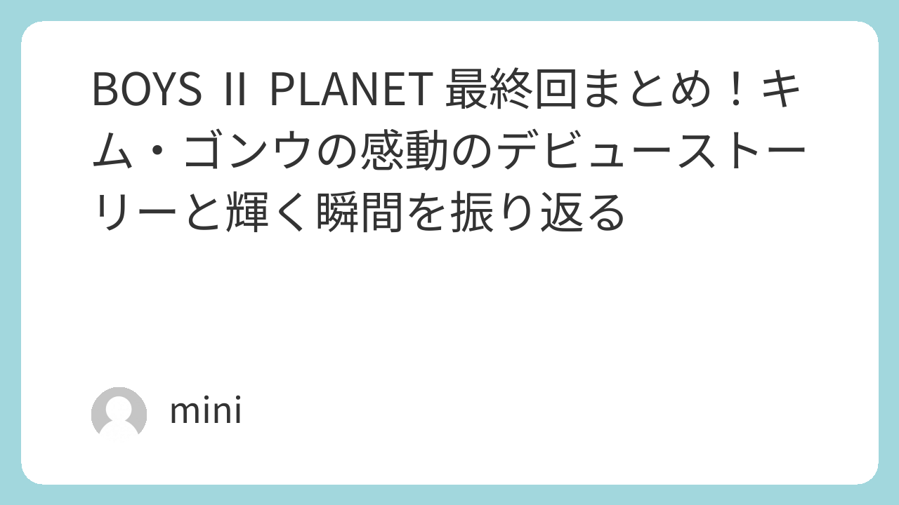 こんにちは、K-POPサバイバル番組大好き人間のminiです。BOYS Ⅱ PLANET(以下、ボイプラ2)がついに最終回を迎えましたね。2025年9月25日20:00から深夜0:00頃にかけて放送された第11話のファイナルは、涙なしには見られませんでした。今回の記事では、7年間の練習生生活を乗り越え、ついにALPHA DRIVE ONE(アルファドライブワン、以下ALD1)のメンバーとしてデビューを掴んだキム・ゴンウ(김건우、以下ゴヌくん)くんのプロフィールから順位推移、最終回のパフォーマンス詳細、投票結果まで、X(旧Twitter)のファン投稿や公式情報を基に、情報をまとめていきます。ボイプラ2のファンなら必見! ゴヌくんの魅力にどっぷり浸かりましょう。