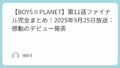 2025年9月18日(木)21:20頃からABEMAで日韓同時放送された「BOYS Ⅱ PLANET」第10話は、第3回生存者発表式を中心とした内容でした。この式では、24名の練習生から8名が脱落し、ファイナルステージに進む16名の生存者が決定。放送は約2時間半にわたり、緊張感あふれる発表と練習生たちの感情が交錯する感動的なシーンが展開されました。以下では、発表結果、注目ポイント、ファン反応をX(旧Twitter)の投稿や関連情報を基にまとめます。
