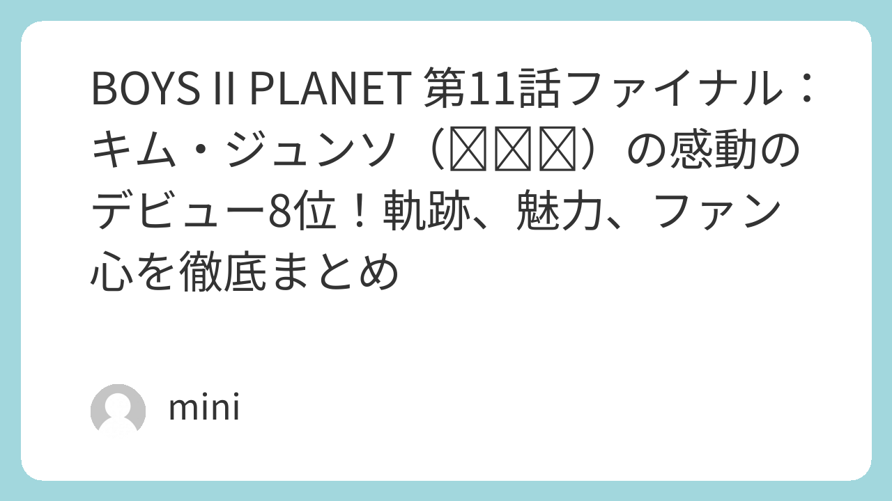 このエピソードは、BOYS II PLANET史上最高視聴率を記録。ジュンソのファイナルは「逆転の象徴」として、後世に語り継がれそう。筆者、放送終了後3時間放心…。あなたもリピート視聴をおすすめ!