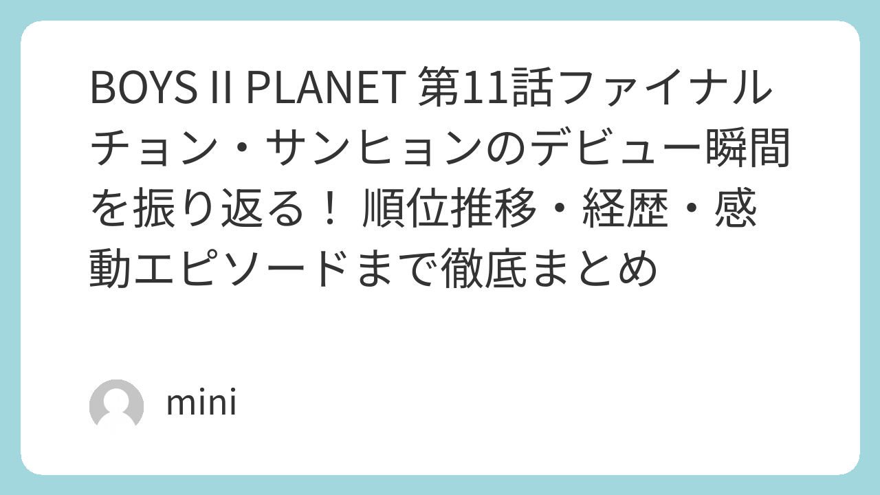 BOYS II PLANETは、2023年の大ヒット番組『BOYS PLANET』に続くサバイバルオーディションで、Mnetが制作。世界中から集まった練習生たちが、グローバルボーイズグループ「ALPHA DRIVE ONE(ALD1)」のメンバー7名を決めるというもの。放送開始から毎週の順位発表でファンの投票が熱を帯び、第11話のファイナルはまさにクライマックス。サンヒョンくんは、WAKEONE所属の若き才能として注目を集め、ファイナルで386万2466票を獲得して7位に輝きました。 この記事では、サンヒョンくんのプロフィールから順位推移、第11話のハイライト、他練習生との心温まるエピソードまでを詳しくまとめます。さあ、一緒にサンヒョンくんの軌跡を振り返りましょう!