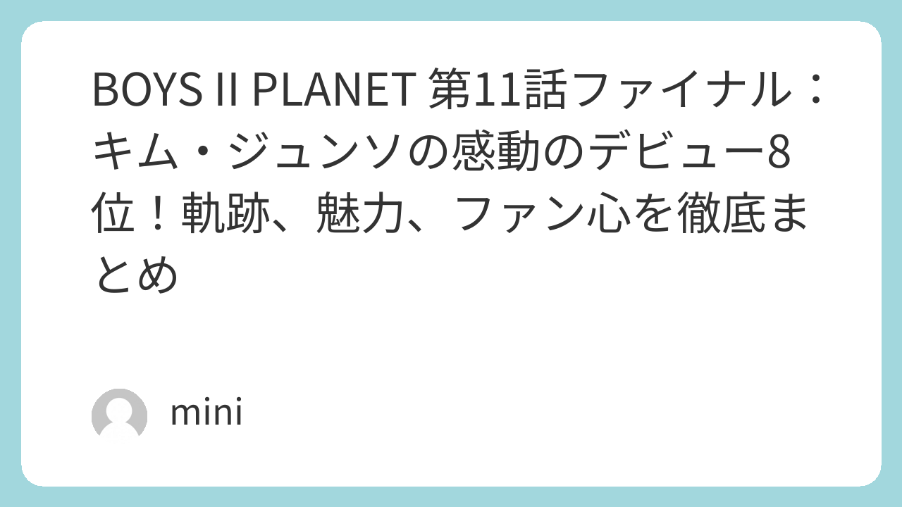 こんにちは。2025年9月25日、Mnetの新作サバイバルショー「BOYS II PLANET」の第11話ファイナルが放送されました。夜8時から深夜0時までの長丁場、ドキドキの連続で心臓が持たない…!特に、最後の最後でキム・ジュンソ(김준서、以下ジュンソ)の名前が呼ばれた瞬間、涙腺崩壊。画面越しに彼の努力が報われた姿を見て、胸が熱くなりました。ジュンソは最終的に8位でデビューを果たし、新グループ「ALPHA DRIVE ONE(ALD1)」のメンバーとして新たなスタートを切りました。